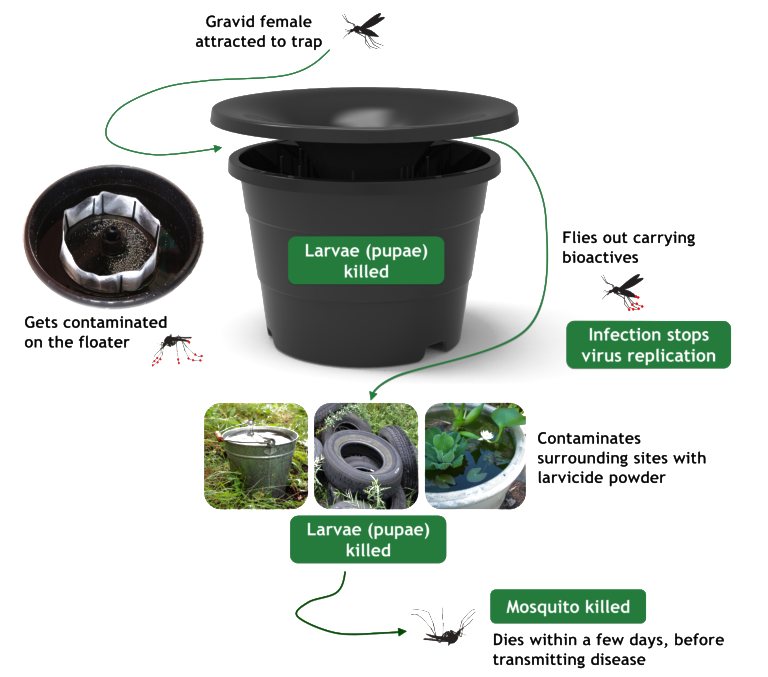 The In2Care® Mosquito Trap is made of durable plastic and uses water with an odor lure to attract egg-laying Aedes mosquitoes. Once inside, mosquitoes contact the specially treated gauze near the water surface and get contaminated with a larvicide and a fungus. We exploit the fact that Aedes like to divide their eggs over multiple sites; by letting them fly out of the Trap whilst carrying larvicide on their legs. They transport the larvicide and contaminate several breeding sites around the Trap. In this way, we can kill larvae in small and hard to find breeding sources. The mosquito also gets infected with an insect-specific fungus that kills her before she can spread disease.